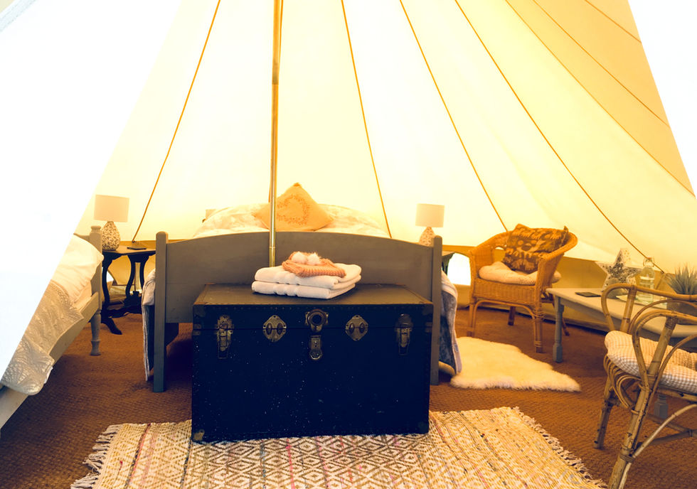 The original, and extremely popular 'Glamping Meadow' is home to 10 stunning Bell Tents. Stay in a spacious, fully furnished bell Tent, situated a short stumble from the Barnyard, in 'St Mildred's Meadow'. Sleep in a painted wooden or iron bed, with a sprung mattress, duck down duvets and pillows with crisp cotton sheets. Enjoy a cosy night with sheepskin rugs, snug throws, and fluffy hot water bottles. Every Bell Tent has it's own electricity supply, so you don't have to leave any of your home comforts behind. Lighting, heating, and fans are at your fingertips, so that you can just sit back and relax!
